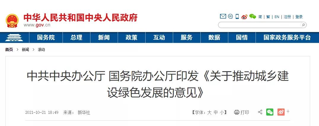 近日,中共中央办公厅、国务院办公厅印发了《关于推动城乡建设绿色发展的意见》,并发出通知,要求各地区各部门结合实际认真贯彻落实。