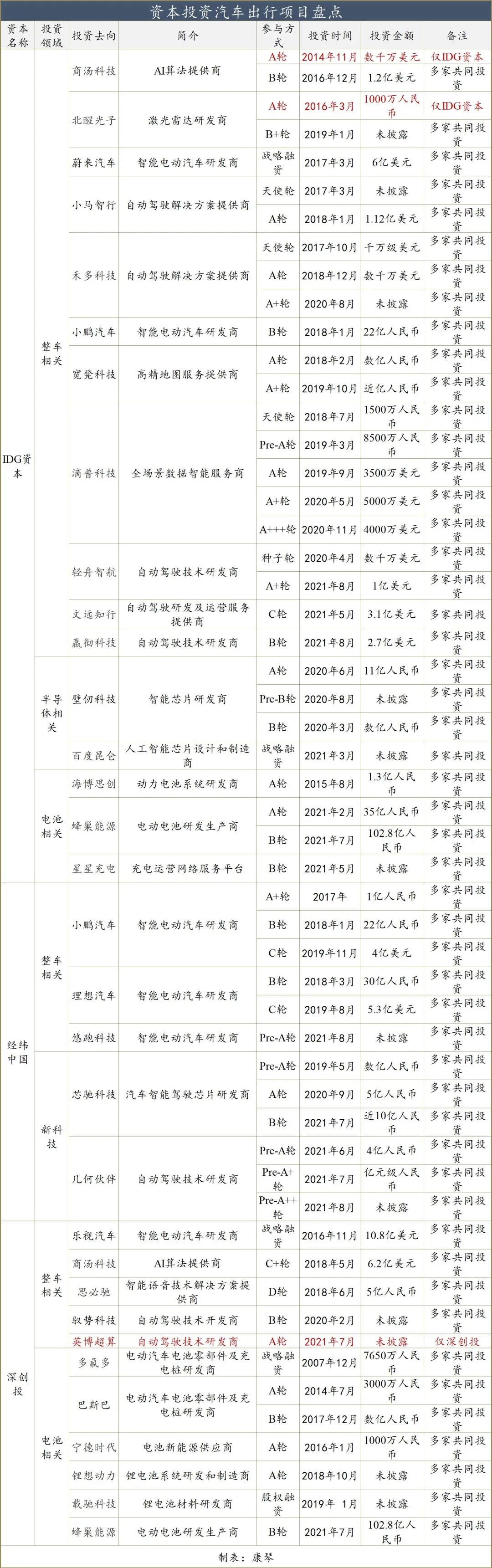 资本投资汽车出行项目盘点2-IDG、经纬、深创投