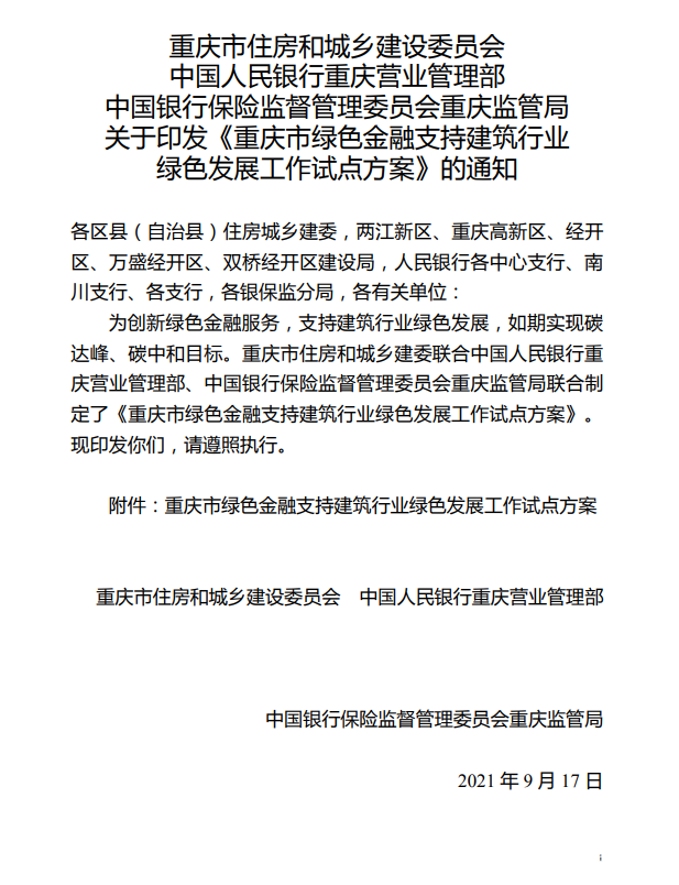 11月12日,重庆市住房和城乡建设委员会等三部门发布关于印发《重庆市绿色金融支持建筑行业绿色发展工作试点方案》的通知。