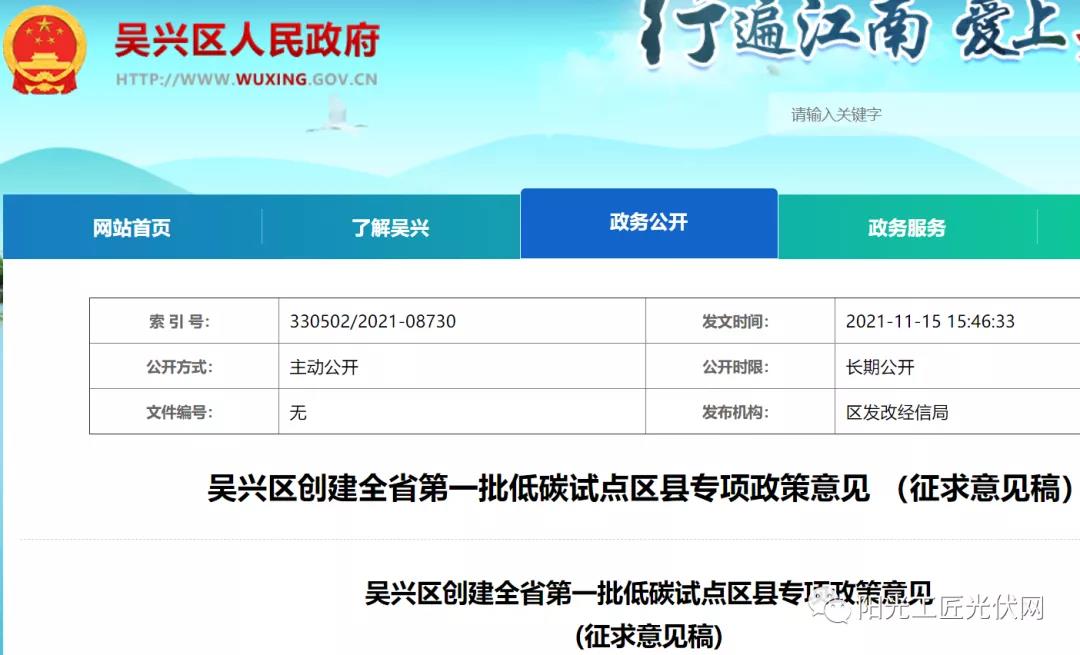 11月15日,浙江湖州市吴兴区发布吴兴区创建全省第一批低碳试点区县专项政策意见(征求意见稿),意见提出,对企业在吴兴区工商业企业屋顶建设光伏项目(建设容量≥0.1兆瓦),按建设容量给予每兆瓦5万元奖励,单个项目最高不超过30万元,建设容量不足1兆瓦的按比例给予奖励。