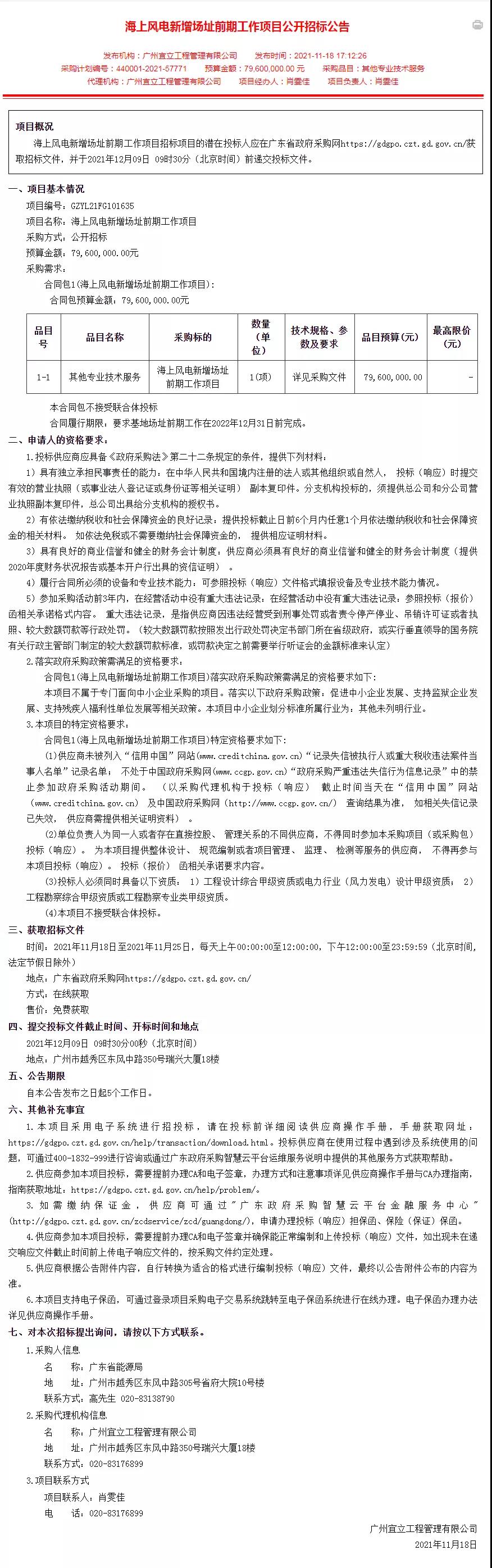 11月18日,广东省能源局启动海上风电新增场址前期工作项目,预算金额达7960万元。公告显示,为了打造广东省粤西、粤东千万千瓦海上风电基地,加强广东省海域海上风电场的规模化和集约化发展,加快广东省海上风电行业健康快速地发展,现开展广东省粤西、粤东千万千瓦海上风电基地的前期工作。
