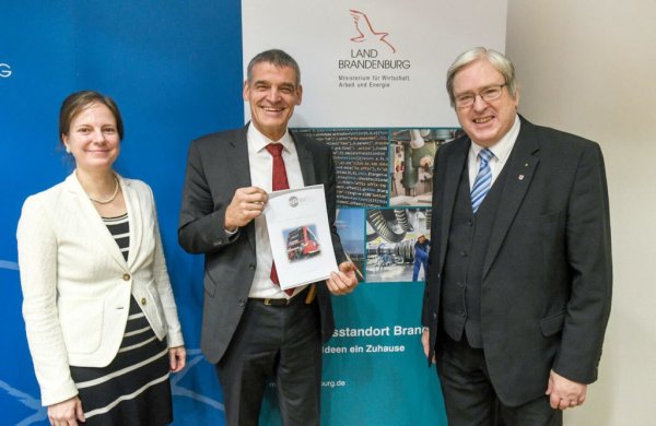 勃兰登堡经济事务部部长施泰因巴赫(SPD)、Desag董事总经理拉尔夫·博梅(M.)和Nacompex董事总经理克劳迪娅·海因(Claudia Hain)。图:JULIAN STAHLE/DPA
