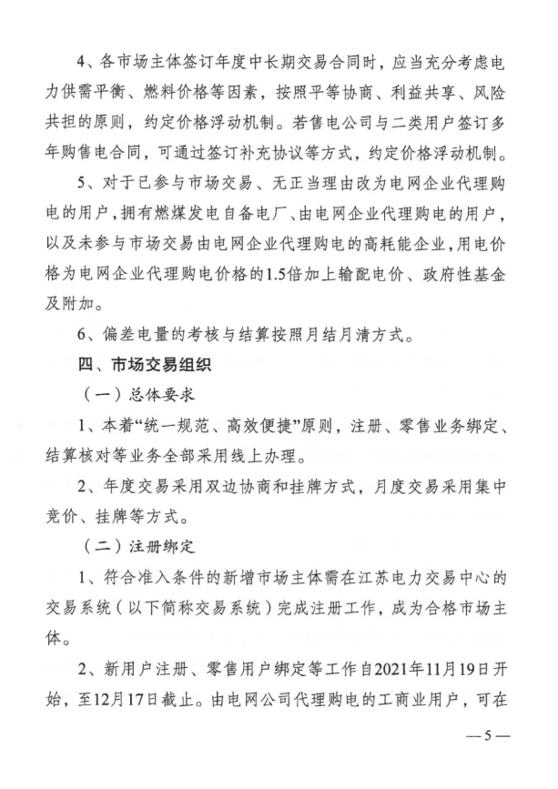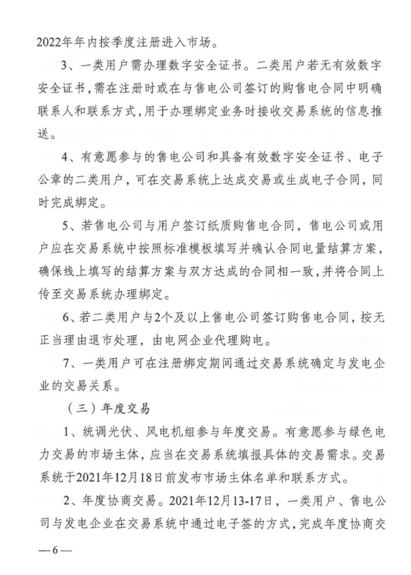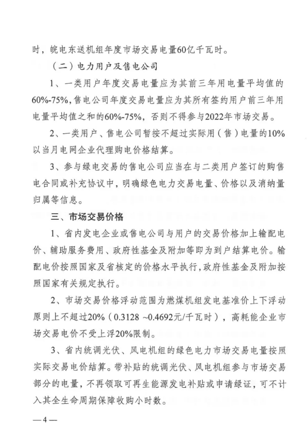 电力用户及售电公司:一类用户年度交易电量应为其前三年用电量平均值的60%-75%,售电公司年度交易电量应为其所有签约用户前三年用电量平均值之和的60%-75%,否则不得参与2022年市场交易。