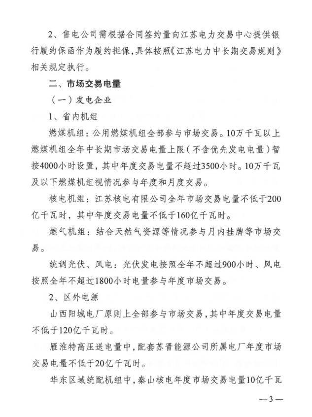 核电机组:江苏核电有限公司全年市场交易电量不低于200亿千瓦时,其中年度交易电量不低于160亿千瓦时。