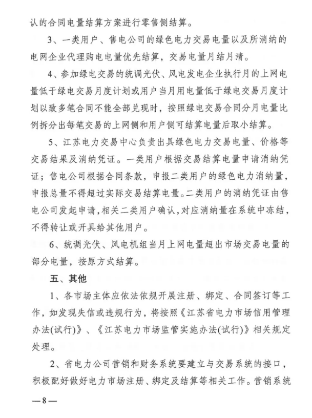 对于省内统调光伏、风电机组的绿色电力市场交易电量按照实际交易电价结算。带补贴的统调光伏、风电机组参与市场交易部分的电量,不再领取可再生能源发电补贴或申请绿证,可不计入其全生命周期保障收购小时数。