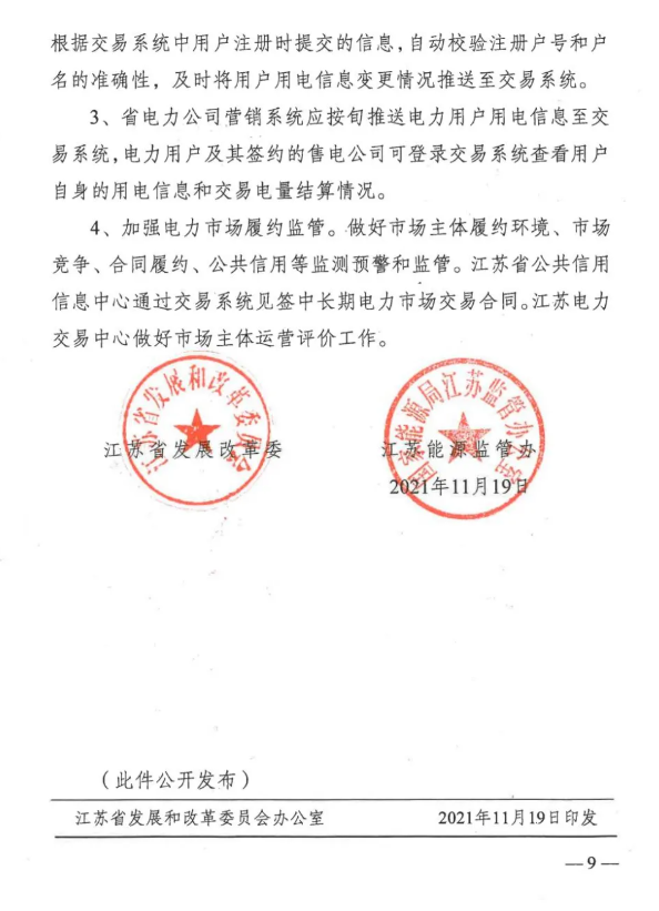 11月19日,江苏省发展改革委、江苏能源监管办公布了《关于开展2022年电力市场交易工作》的通知。其中与风、光相关的:要求光伏发电按照全年不超过900小时、风电按照全年不超过1800小时电量参与年度市场交易。