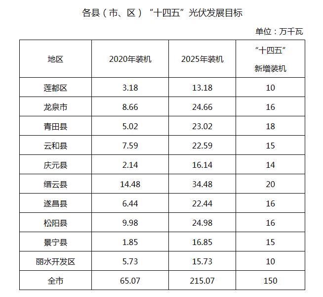 全面贯彻党的十九大和十九届二中、三中、四中、五中全会精神,认真落实国家和省碳达峰碳中和工作部署,牢牢把握生态文明建设要求,加强统筹协调,创新发展模式,加快调整优化能源结构,以分布式光伏整县(市、区)规模化开发为抓手,全面实施“光伏+”工程,推动绿色低碳能源产业高质量发展,着力打造华东绿色能源基地。力争“十四五”全市新增光伏发电150万千瓦,其中市区(含莲都区、丽水经济开发区)新增光伏发电20万千瓦。