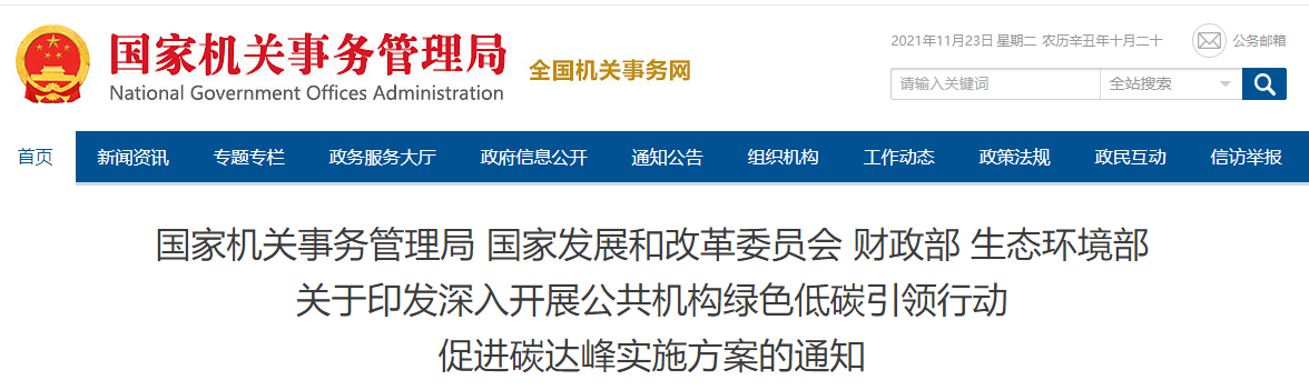 国管局 国家发展改革委 财政部 生态环境部印发《深入开展公共机构绿色低碳引领行动促进碳达峰实施方案》