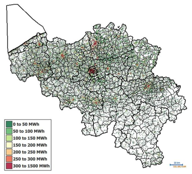 该研究所的专家们确定了适合以上两种技术的所有地点,并将这些地理数据与2017年的技术参数和气象数据结合起来。“该项研究中所报告的新增装机潜力,是假设在每个建筑类型的可用屋顶空间内,按指定的方向和倾斜角度,全部覆盖每平方米226 Wp的光伏模块(SPR- MAX3 -400)后计算得出的,”EnergyVille的专家指出,“在比利时,光伏的有效性有所差别,装置的满负荷工作时间在930至1060小时之间,每年或还有99.3 TWh的潜在额外能源生产。” 在比利时的三个行政自治区中,说佛兰芒语的佛兰德斯地区是屋顶太阳能系统潜力最大的地区,约为65 GW,其次是说法语的瓦隆行政区,约为30 GW,布鲁塞尔首都区约为4.2 GW。截至2020年底,比利时的累计光伏装机容量超过6 GW,这些电力几乎全部来自于住宅和商业光伏系统,仅有少数来源于已建成的地面光伏电站。另一方面,比利时现行的法律对公用事业规模级别的太阳能发电站极为不利,该国绝大多数光伏发电装置的规模不超过10 kW。