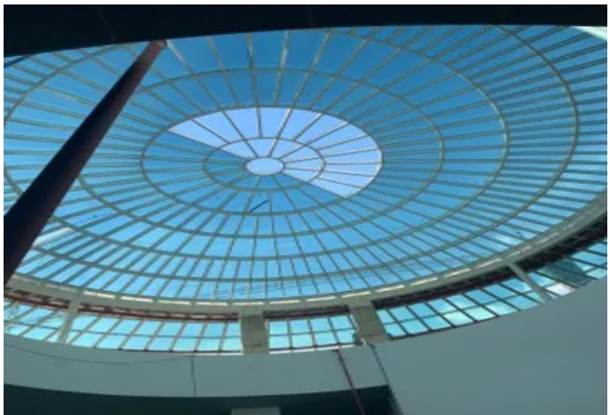 其中,广州美术馆约2万平方米的光伏幕墙面积主要分布在立面和屋面,光伏组件发电项目总发电228.51kWp,可以说,这朵“水中盛放的英雄花”也是一朵名副其实的“绿色环保之花”。立面光伏幕墙的钢结构桁架由爪件控制上下左右四块光伏玻璃,爪件自桁架中心向四周无规律发射,由于现场钢桁架不具备三维扫描建模和全站仪打点的条件,如何保障施工定位准确是项目的核心重难点。而屋面光伏幕墙覆盖北区和东区各16个区域的排布,项目部需克服测量放线工作量大、精度要求高,工程平面弧度、折边、交叉幕墙系统等诸多施工困难,以达到最佳的施工效果,完美还原设计初衷,将光伏幕墙的节能效果达到最佳。