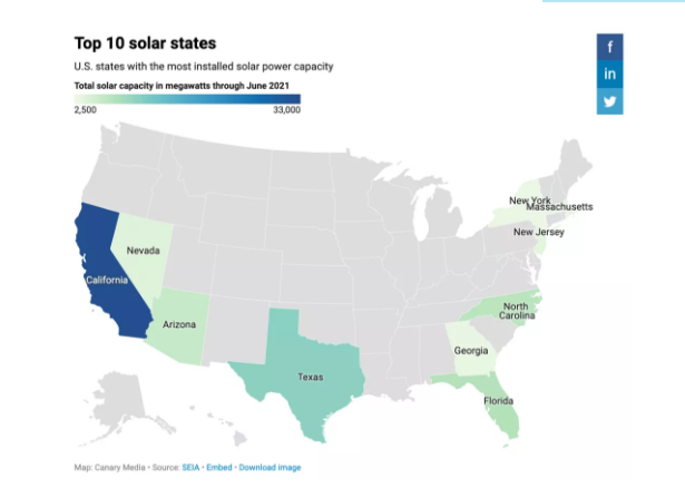 加州位居榜首,这是因为其有利的阳光、气候、地形和政策。2020年,它增加了1.6吉瓦的太阳能发电量,累计占美国装机容量的32%。排名第二的德克萨斯州在2020年增加了2.5吉瓦的太阳能,超过加利福尼亚州,成为公用事业规模太阳能增长的领导者。在2021的第一季度,德克萨斯超过所有其他州,新增1.5吉瓦的新的太阳能发电量。