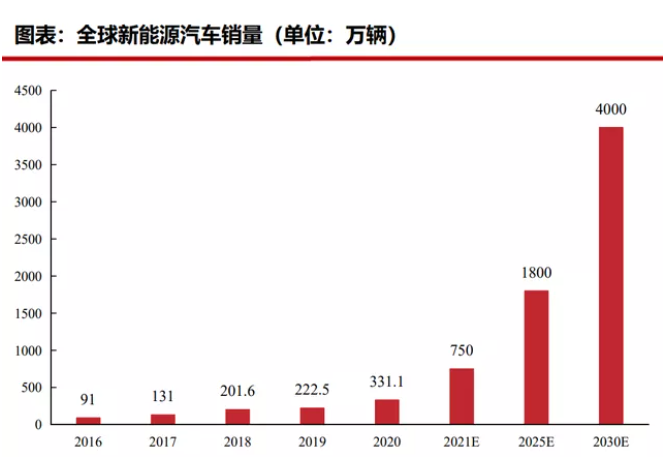 要说近些年最火热的是哪个行业?新能源汽车肯定榜上有名。在全球碳中和的背景下,新能源汽车行业快速增长,据EvTank数据,2021年全球新能源汽车销量可达750万辆,2025年预计将达到1800万辆,2030年将达4000万辆,未来10年的复合增长率将超过20%。