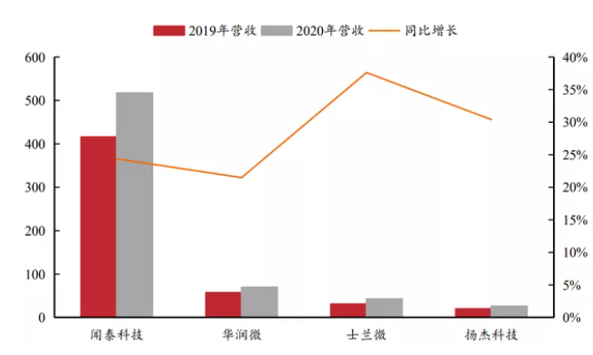 但中国企业的增长势头则更为强劲,2020年中国排名前4的企业中,闻泰科技营业收入为517亿元,同比增长24.36%,华润微营业收入69.77元,同比增长21.5%,土兰微增长37.61%,扬杰科技增长30.39%,普遍远远超过了全球市场6%左右的复合增长率。