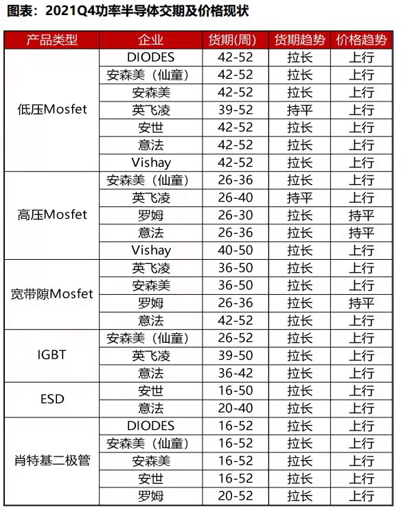 再加上疫情的影响,全球各大厂商出货在一定程度上受阻,导致功率半导体市场缺货更加严重,交易周期进一步拉长。在今年4季度,各类型的IGBT、MOSFET交货周期普遍维持在25周以上,这毫无疑问将进一步国内功率半导体市场的国产化替代。从未来趋势上看,功率半导体产品供不应求的局面短期内很难缓解,价格上也保持持续上行的态势。
