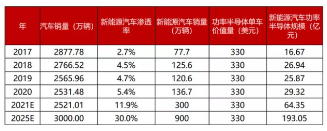 据GGII预测,2021年我国新能源汽车销量将达到300万辆,同比增长120%,根据中国汽车协会发布的《中国汽车市场中长期预测(2020-2035)》报告,预计2025年新能源汽车销量将达到900万辆。每辆新能源汽车中的功率半导体成本按330元计算,则可以估算出2025年我国新能源汽车领域功率半导体的市场规模将达到193亿元,未来5年的复合增长率将达到32%。