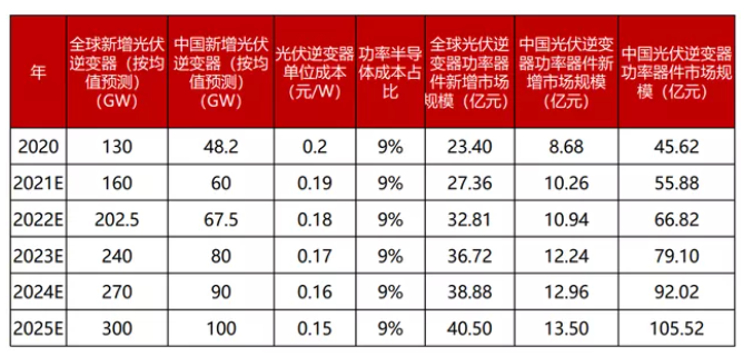 在光伏发电中,IGBT是光伏逆变器提高能量转化的核心部件。据IMSResearch数据,到2025年,我国光伏市场新增装机量预计可达到110GW,占全球新增装机量的三分之一,预计2021至2025年,全球光伏逆变器功率半导体市场规模将增长176亿元,我国市场约增长59.9亿元。