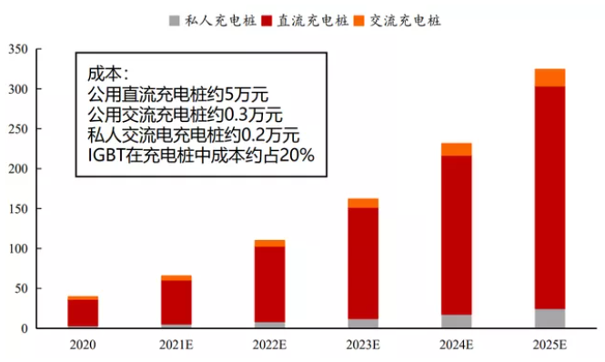 随着新能源汽车行业的发展,充电桩在经历了萌芽期之后,已经正式进入了发展期。2020年我国充电桩保有量为166万台,预计到2025年将达到1240万台,复合增长率达45.7%。而IGBT在充电桩的成本中大约占比20%左右,可以测算出2025年我国充电桩IGBT的市场规模将达到324.2亿元。