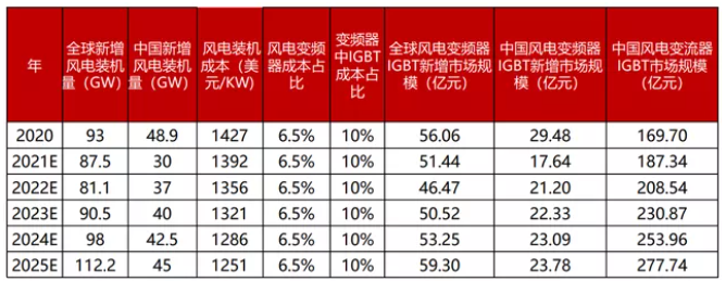 而风力发电中,需要运用到大量的IGBT、MOSFET、GTO等功率器件。预计2021至2025年,全球风电变频器件市场规模将增长261亿元,我国市场规模将增长108亿元。