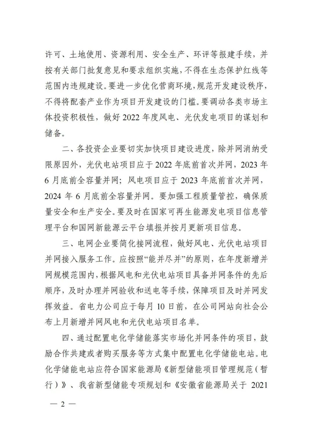 文件还要求各投资企业要切实加快项目建设进度:除并网消纳受限原因外,光伏电站项目应于2022年底前首次并网,2023年6月底前全容量并网;风电项目应于2023年底前首次并网,2024年6月底前全容量并网。