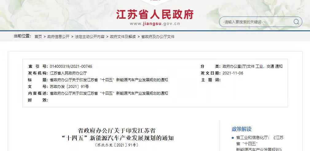 《江苏省“十四五”新能源汽车产业发展规划》已经省人民政府同意,现印发给你们,请认真组织实施。