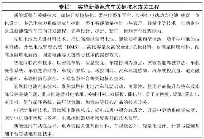 大力发展纯电动汽车、插电式混合动力(含增程式)汽车、燃料电池汽车等技术,强化整车集成技术创新,优化高性能整车模块化平台,完善热源安全智能管理技术,提高新能源整车综合可靠性。提升全气候、高安全、长续航动力电池系统,高功率、高密度电驱动系统,节能汽车动力耦合系统等核心技术水平。加强车用芯片、车载雷达、车载计算单元、车载操作系统、线控底盘、信息安全、感知雷达、边缘计算、测试工具等关键技术攻关。突破膜电极(质子交换膜、碳纸/碳布、催化剂)、氢气循环系统等技术,提升氢燃料电池系统、双极板、空气压缩机、高压储氢瓶、加氢装置等技术水平。引导开展关键基础技术、先进基础工艺、关键基础材料等共性技术的联合研发。