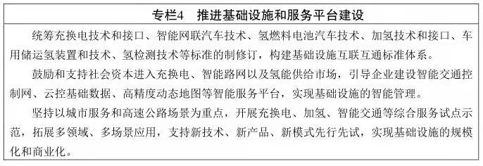 持续完善充换电服务设施网络,深化推动国家级车联网先导区建设,积极开展氢燃料电池汽车试点示范应用,探索推动政策和法规领域改革创新,不断完善技术、产品、应用等标准体系,促进互联互通,适度超前规划引领,构建布局合理、支撑有力的基础设施体系。