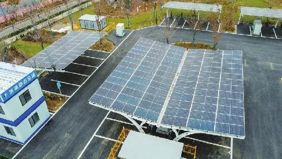 济南小清河北路一处停车场,遮阳棚顶部安装了光伏发电组件。