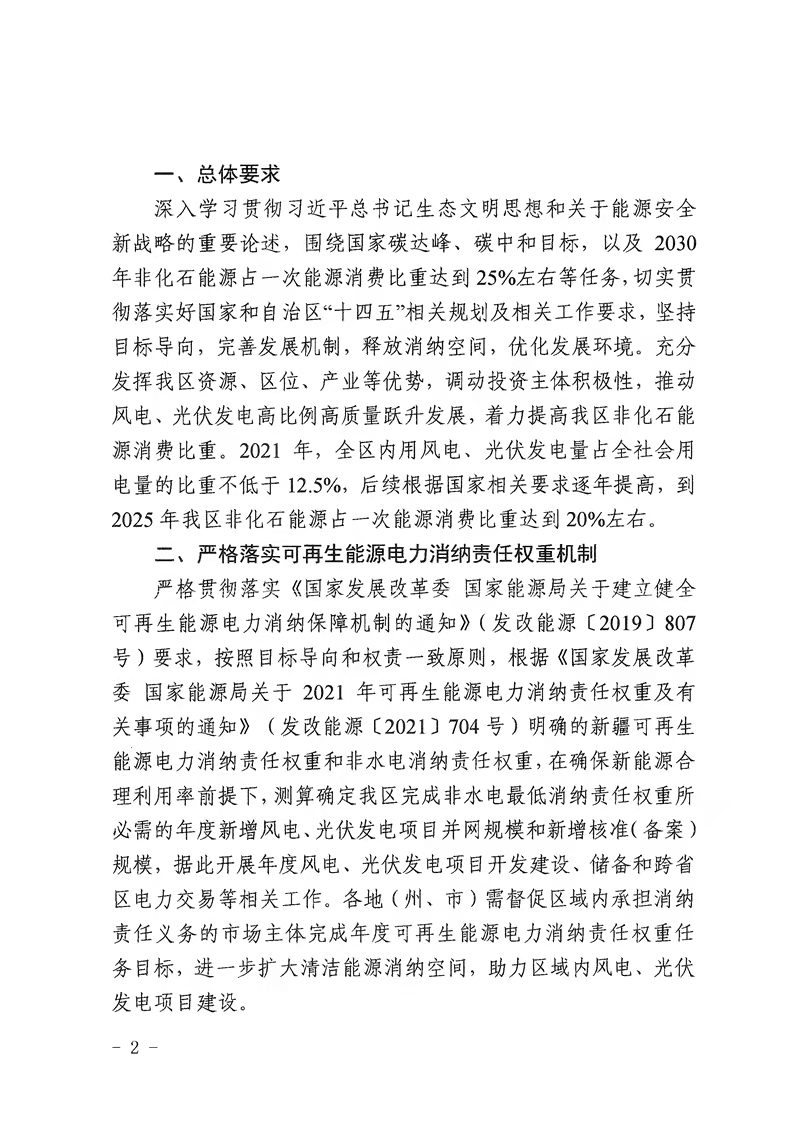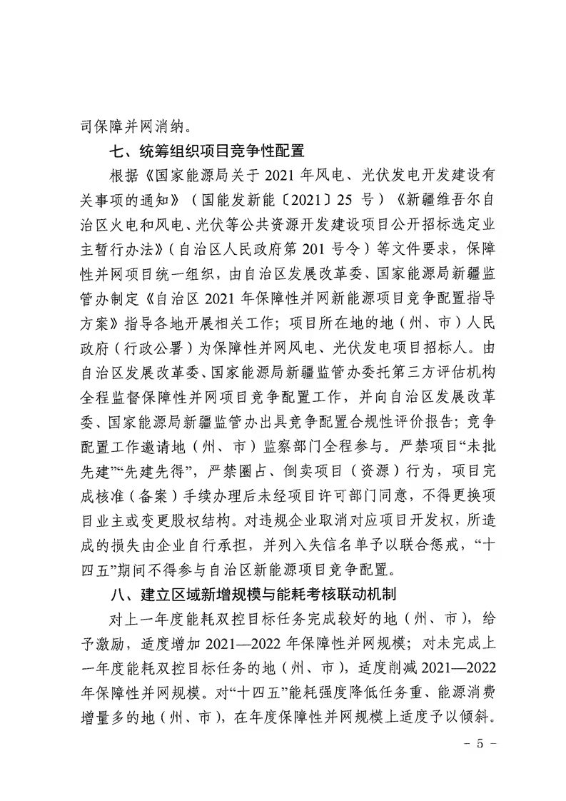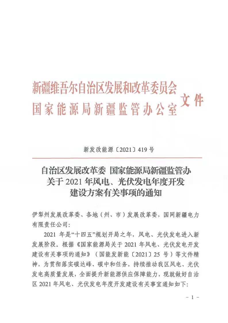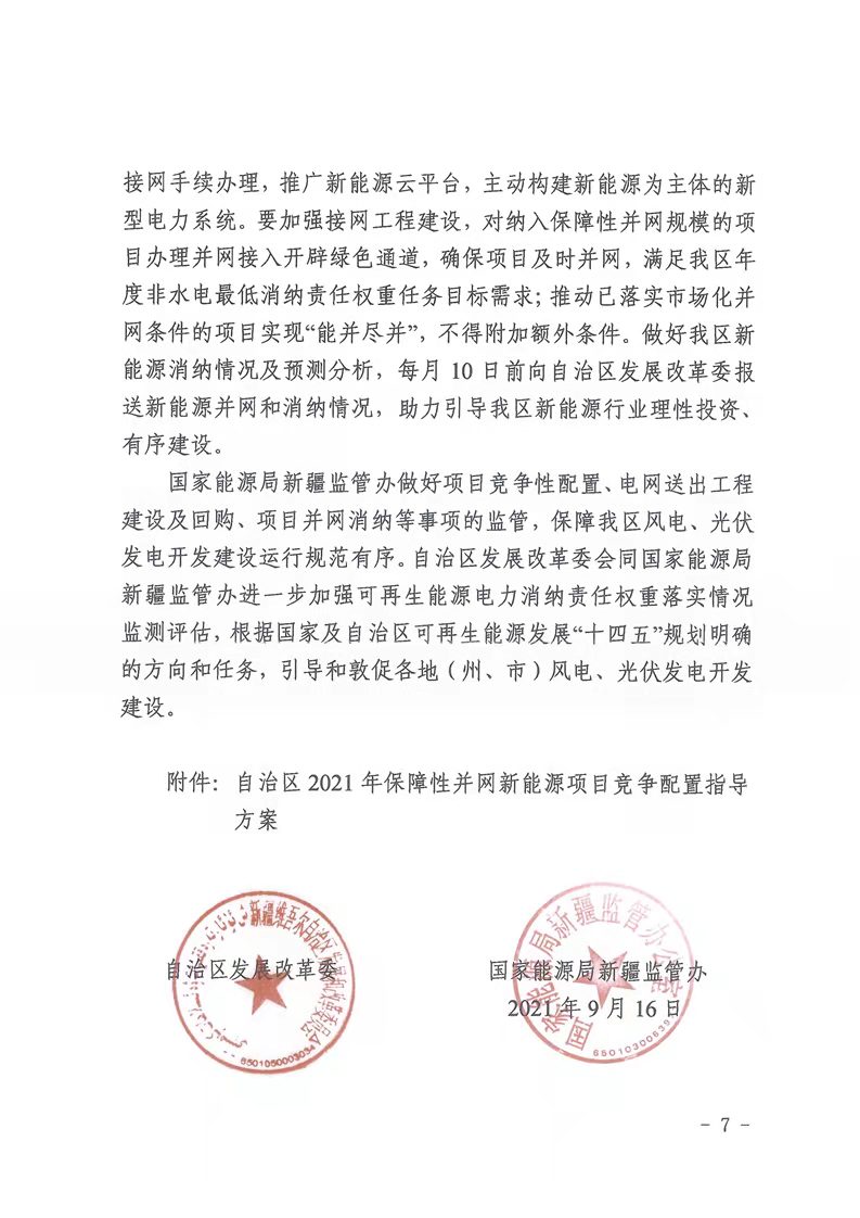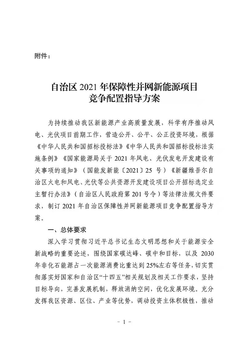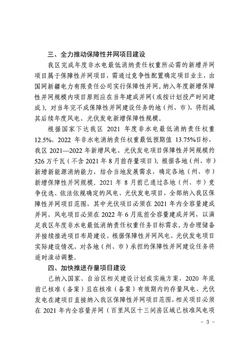 日前,新疆维吾尔自治区发改委发布《关于2021年风电、光伏发电年度开发建设方案有关事项的通知(征求意见稿)》及《新疆维吾尔自治区2021年保障性并网新能源项目竞争配置指导方案》。根据国家下达新疆2021年度非水电最低消纳责任权重12.5%,2022年非水电消纳责任权重最低预期值13.75%的目标进行测算,2021年-2022年,新疆新增风电、光伏发电项目保障性规模约5.26吉瓦。