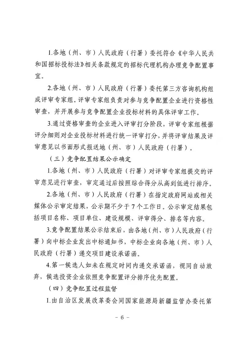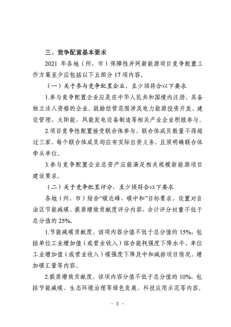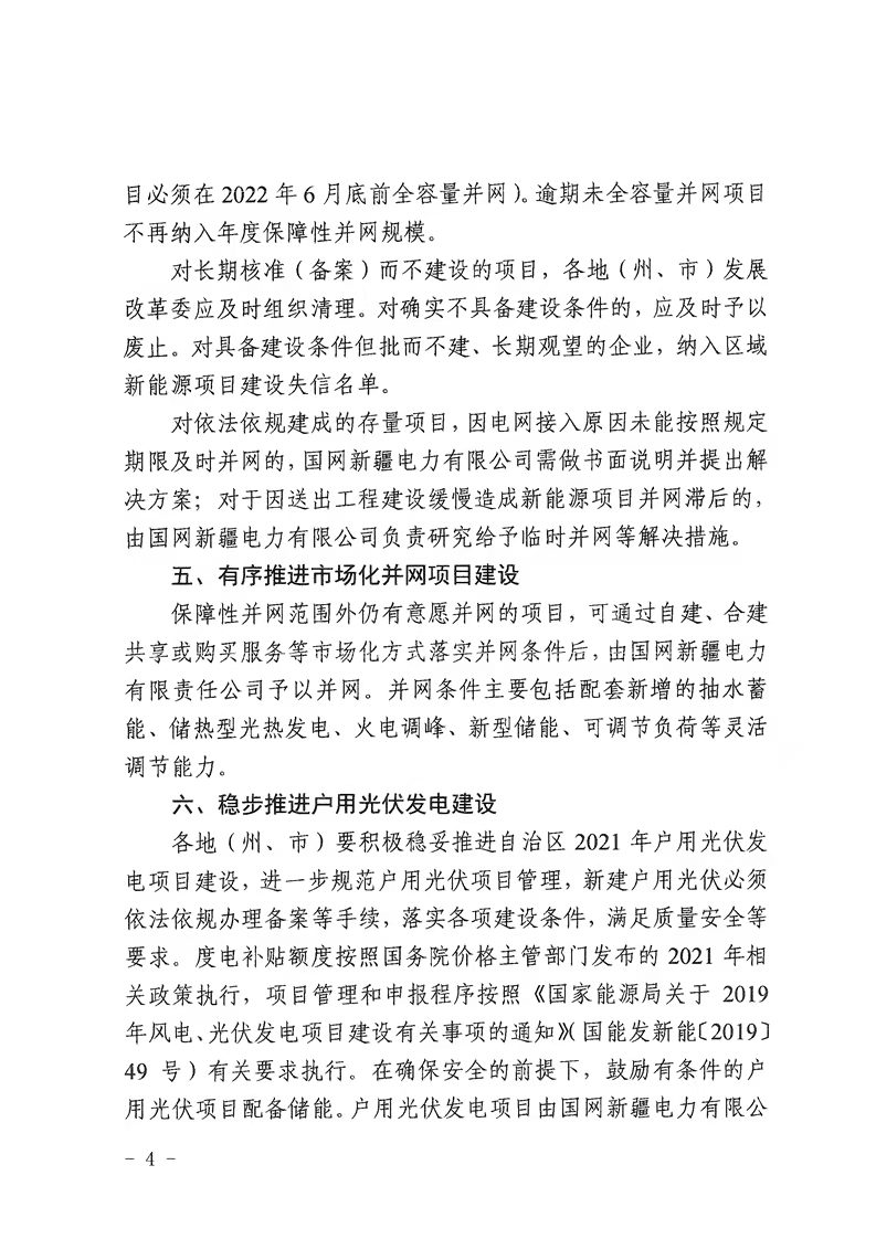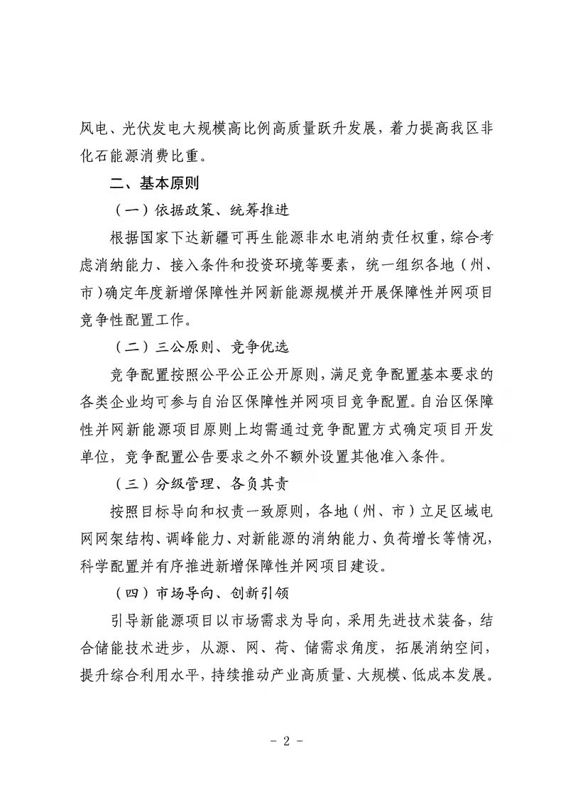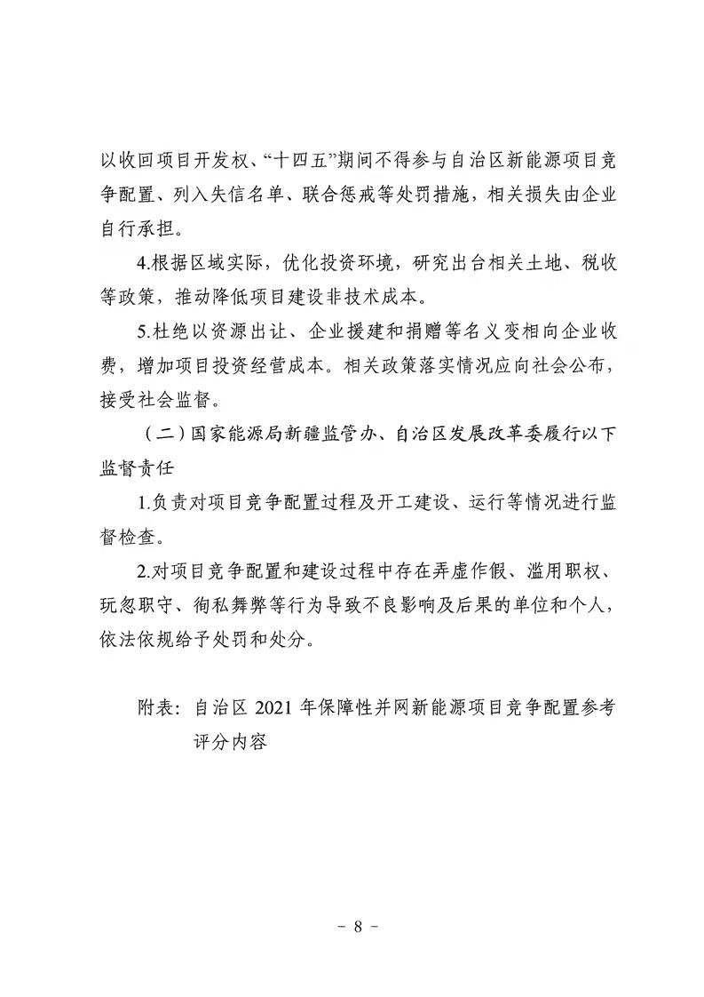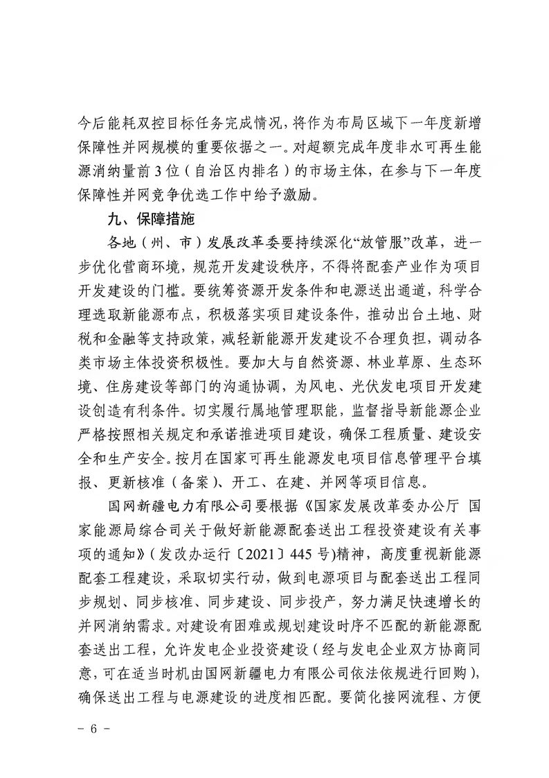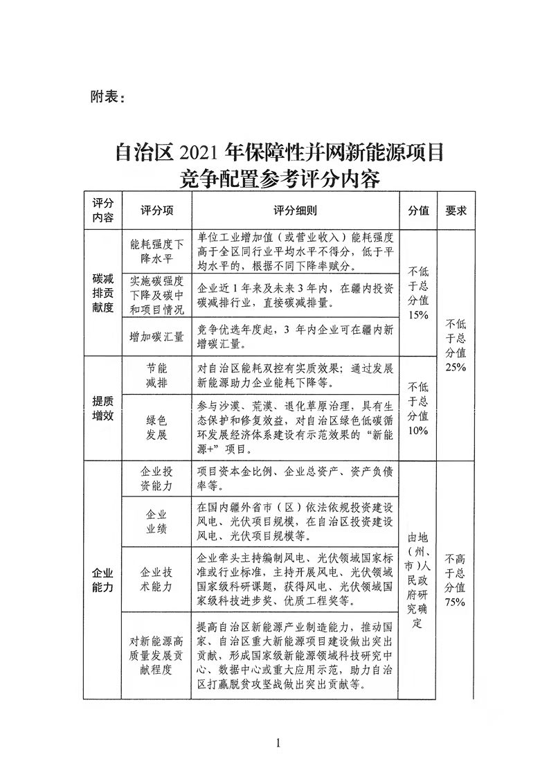 日前,新疆维吾尔自治区发改委发布《关于2021年风电、光伏发电年度开发建设方案有关事项的通知(征求意见稿)》及《新疆维吾尔自治区2021年保障性并网新能源项目竞争配置指导方案》。根据国家下达新疆2021年度非水电最低消纳责任权重12.5%,2022年非水电消纳责任权重最低预期值13.75%的目标进行测算,2021年-2022年,新疆新增风电、光伏发电项目保障性规模约5.26吉瓦。