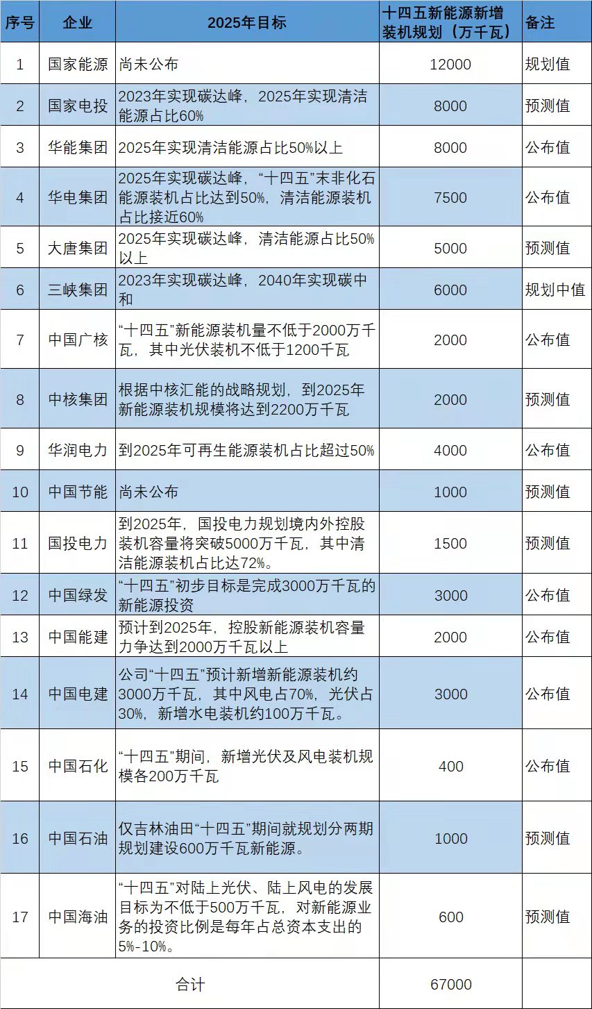 据统计,目前17家能源电力央企基本都已公布“十四五”期间新能源的投资目标规模,总计6.7亿千瓦。