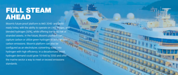 “液化天然气作为一种可行的低碳燃料的出现,再加上布鲁姆燃料电池的适应性,将支持航运业雄心勃勃的气候目标,例如国际海事组织(International maritime Organization)要求在未来几年将温室气体排放量减半。”