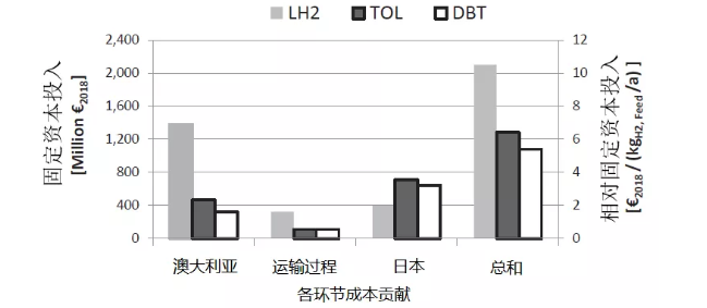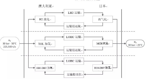 Moritz Raab在《Comparative techno-economic assessment of a large-scale hydrogen transport via liquid transport media》一文,以澳大利亚-日本为例,将液态氢的大规模点对点输运与LOHC(考虑甲基环己烷TOL和氢化二苄基甲苯DBT两种载体)的输运进行了比较。
