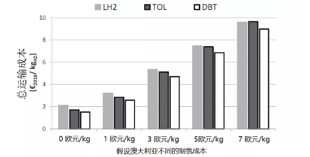 由于氢在运输过程中的损耗将影响最终运输成本,因此制氢成本对运输总成本有影响。见图表5。TOL方式因为运输产出率低,成本影响明显。当制氢成本为5欧元/kg时,TOL总运输成本已经与液氢基本一致;当制氢成本为7欧元/kg时,TOL总运输成本已经高于液氢。而在各种不同的制氢成本条件下,DBT均是最经济的运输方式。