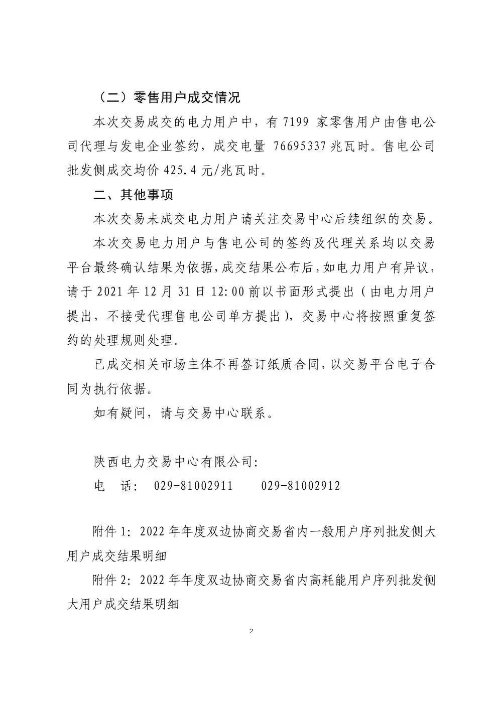 本次交易成交的电力用户中,有7199家零售用户由售电公司代理与发电企业签约,成交电量76695337兆瓦时。售电公司批发侧成交均价425.4元/兆瓦时。与陕西燃煤发电上网电价基准价354.5元/兆瓦时相比,上涨了20%。