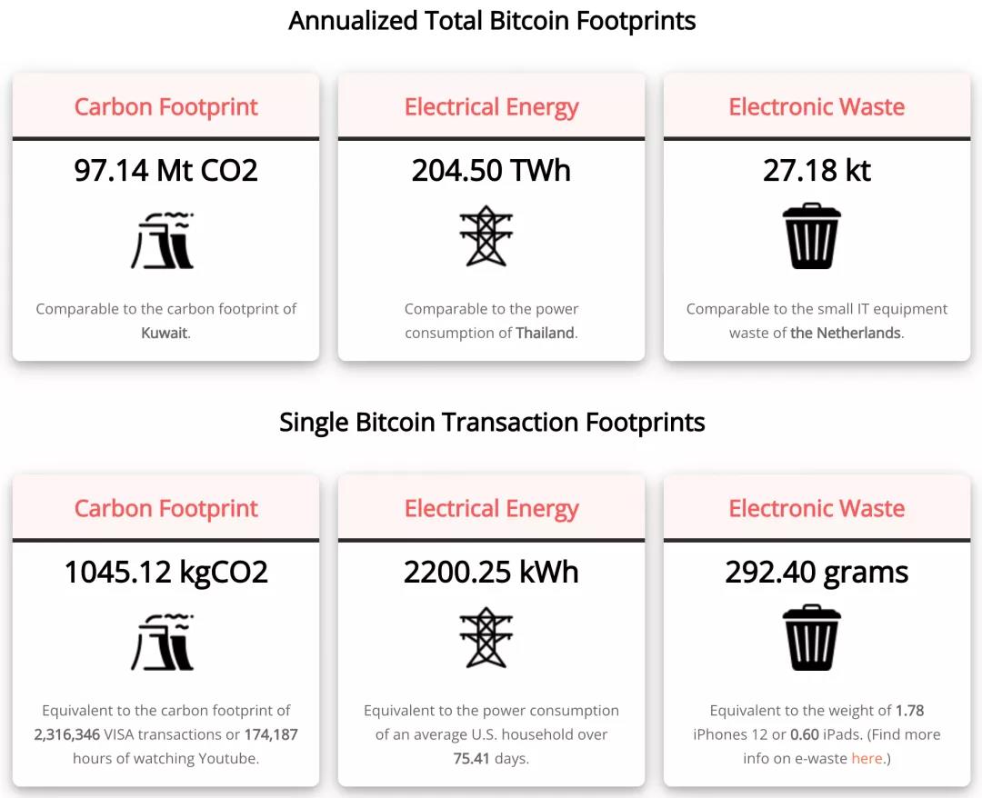 2021年单笔比特币交易足迹、耗电量、电子垃圾: