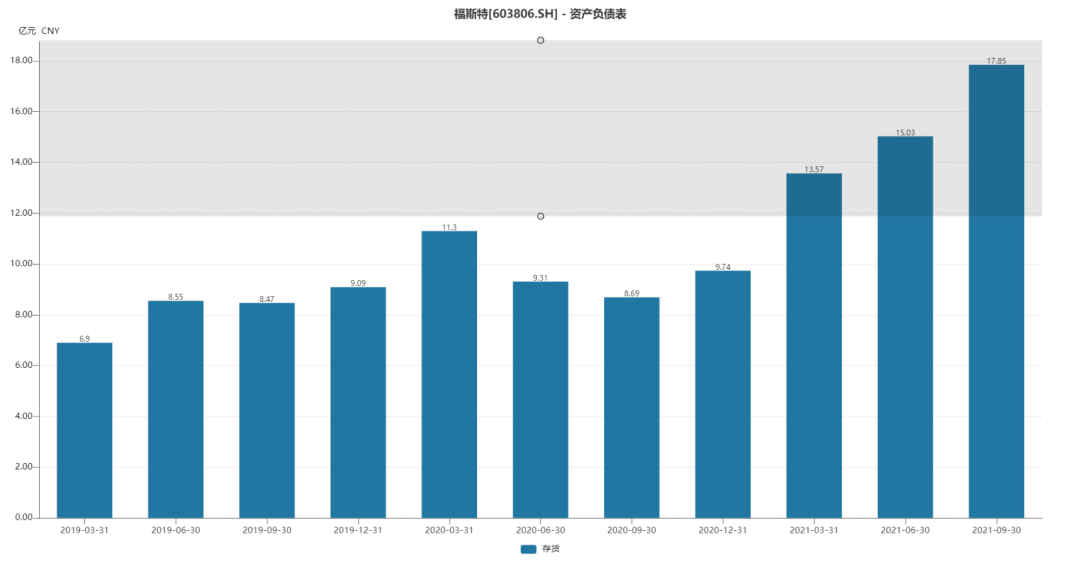 可见2021年9月底,公司存货创历史新高,高达17.85亿。应该讲,2020年之前,公司的存货管控还是很稳妥的,一直在8-9亿的水平上波动。但是到了2021年,不知道为什么,公司的存货一路飙升。