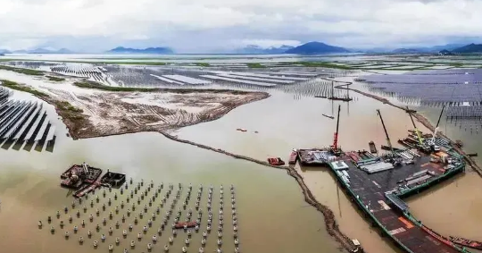 滩涂海潮间带每天经历两次潮涨潮落,受潮水涨落、风急浪高、淤泥沉降等多重条件制约,有效作业时间短,材料运输困难,施工难度极大。