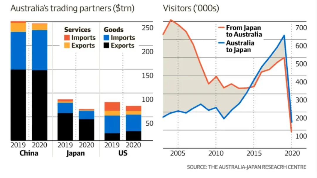 左图为澳洲的贸易伙伴,中国第一,日本第二。右图为日本与澳洲来往人数。