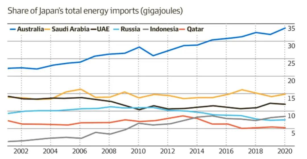 日本总能源进口来源中,澳大利亚占主要位置。(单位:千兆焦耳)