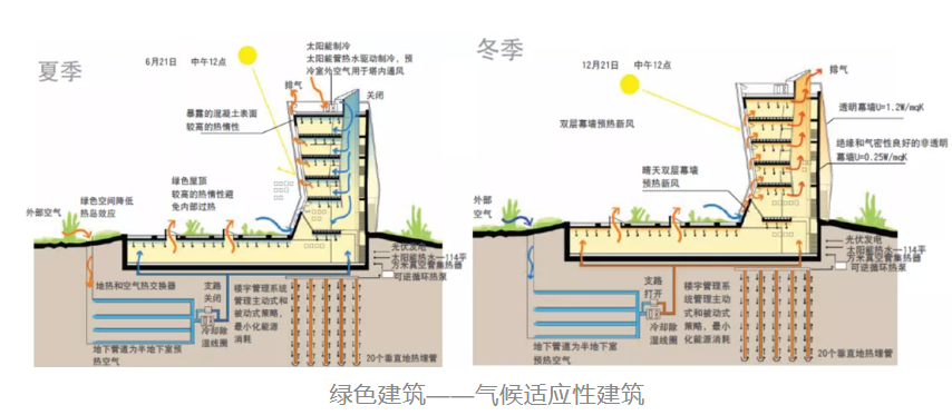 浅层地热能,空气源热泵、深层地热源在建筑上的应用都属于“低品质的能源”,因为这些能源最高温度往往都是在100摄氏度上下,而高品质能源例如电能是可以长距离输送和高效转换的能源。这些高品质能源一旦与峰电交易、碳交易相结合,就可以为用户带来足量的现金流。建筑物产生的绿色电力可以高效转化为其它类别的能源,这样的高品质能源不仅可以长距离输送,也可以很方便的储存。低品质能源可在建筑内作为制冷或供暖充分应用,而高品质能源则可以作为电网的调峰能源适时交易出售。如果每一个建筑都能实现碳中和,那么整个城市碳中和就能顺理成章地完成。总的来说,在“建筑结构”的革命上,首先应该考虑尽可能充分利用就地产生的低品质能源,输出和交易高品质能源。除此之外,“碳中和建筑”必然也是一种气候适应性建筑,这就要求“碳中和建筑”需像鸟的羽毛一样,根据自然气候进行自适应调节变化。