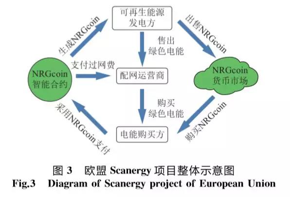 根据欧盟“2050能源路线图”,欧盟将在2050年减少80%的温室气体排放。能源区块链技术可支撑分布式能源的p2p直接交易,所发电能无需远距离及升降压传输,交易不必通过传统中心化、集中式的模式,可促使能源就地消纳,降低长距离输电 造成的线路损耗,提高能源效率,Scanergy项目是受到欧盟第七框架计划资助项目之一。Scanergy项目同样基于以太坊的智能合约通用平台。其整体示意图如图3所示。电能生产者向配电网输入、售出绿色电能时,配网运营商会进行确认,确认成功后智能合约将会生成相应的虚拟代币(NRGcoin)并将代币提供给绿色电能生产方。当购 电方期望购买绿色清洁能源时,需使用NRGcoin支 付。可使用欧元、美元等货币在外部交易市场购买 NRGcoin,1kW·h的绿色电力被规定永久等价 1个 NRGcoin。
