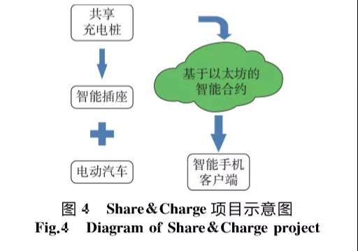 目前,德国正在大力推行能源转型,推广电动汽车的使用并考虑禁售燃油汽车。然而,充电设施数量不足、充电交易不透明、各家充电公司支付协议和支付方式不统一等因素制约着电动汽车的发展。共享充电桩被认为是区块链技术最适用能源方面的领域之一。德国Share&Charge项目是将区块链技术应用在共享充电桩领域的项目之一,其整体示意如图4所示。