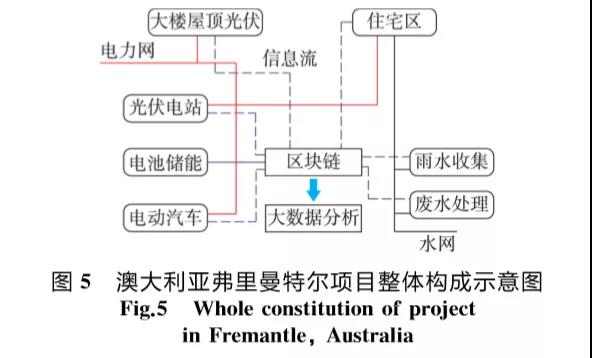 目前,弗里曼特尔项目得到了来自澳大利亚政府的大量资助、高校的科研支撑与传统电网运营商的支持。该项目旨在评估区块链技术与大数据分析技术在分布式的能源系统以及水循环系统的作用, 探索将这些新兴信息技术与原有基础设施和可再生 能源发电设备等设备进行深度融合的机制,从而实现未来零碳绿色智慧城市的目标。在该项目中,为了达到节约用水的目的,对雨水进行收集并对废水进行处理。采用先进智能计量设施对电量、水量等信息进行采集,并运用大数据分析实现水资源和电 力资源的管理优化,提高资源利用率。光伏电站、电池储能、电动汽车、商业大楼屋顶光伏、居民用户等可以通过基于区块链的P2P的电力交易系统进行电力交易,无需通过第三方。该项目整体构成示意如图5所示。