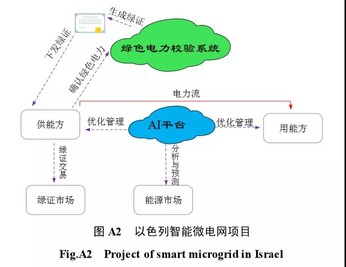 目前,以色列已建成一个基于区块链技术和人工智能的微电网试点工程,以实现绿色电力认证、电力交易、区域能源优化管理和p2p等功能。以色列 智能微电网项目利用区块链信息不易篡改的特性,可较方便对绿色电力的来源进行认证并对可再生能源生产者颁发绿色证书。绿色证书可以通过基于区块链智能合约的绿色证书交易平台自动进行交易并进行记录。人工智能与机器学习算法可对可再生能源出力、用电量等历史数据进行分析预测,结合能源市场,对供能方、用能方的用能策略与安排进行优化 协调。区块链去中心化的特性,可以保证微电网内的用户进行P2P电力交易。该项目整体示意图如 附录A图2所示。