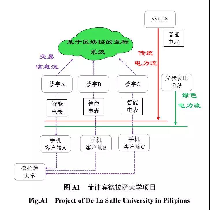 菲律宾德拉萨大学项目相当于一个小型的去中心化能源管理与交易系统。该项目以德拉萨大学内的校园微电网项目为基础,包括3个楼宇负荷和1个光伏发电系统。区块链的去中心化特点可以支持不同楼宇间的用户进行p2p电力直接交易,保证楼宇的电力供需平衡。用户可通过基于量子链的移动客户端设备平台对光伏发电进行竞价,报价最高者将获得清洁能源的使用权。智能电表会对楼宇的电量交易进行记录,利用区块链实行分布式记账的特点,保障交易数据存储的安全性和可靠性。该项目整体示意图如附录A图A1所示。