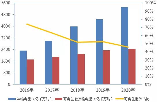 “十三五”期间,我国特高压工程建设进展迅速,特高压线路输送电量和输送可再生能源电量逐年增加,“西电东送”工程稳步向前,但输送可再生能源电量的比重反而在下降,2020年我国22条特高压输送通道平均可再生能源占比为46%,创下近五年新低。2021年10月24日,国务院印发的《2030年前碳达峰行动方案》提出“严控跨区外送可再生能源电力配套煤电规模,新建通道可再生能源电量比例原则上不低于50%。”可以预见,随着全社会对碳达峰、碳中和目标形成共识以及国家政策引导,清洁能源占比将持续提升。