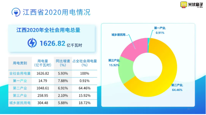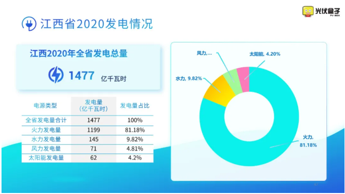 而2020年江西全省发电总量为1477亿千瓦时,其中光伏发电占比4.2%,发电量为62亿千瓦时。