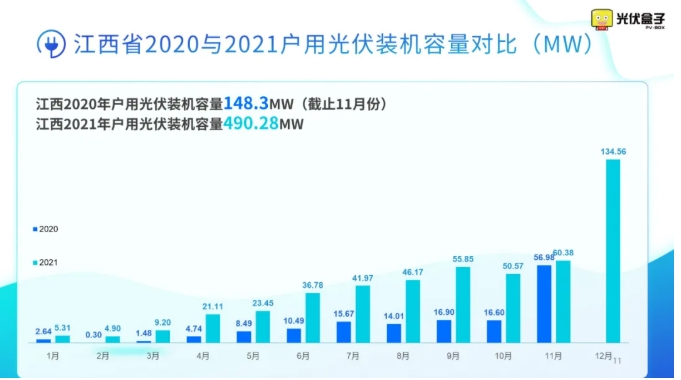 其中,户用光伏发展势头旺盛。江西2020年户用光伏装机容量148.3MW(截止11月份),江西2021年户用光伏装机容量490.28MW。