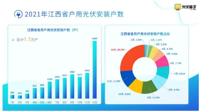 2021年江西省户用光伏安装总计1.7万户,其中12月安装近4500户,占全年安装户数的26.33%。