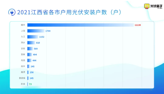 赣州作为江西万家屋顶政策推广力度较大的市之一,户用光伏发展有良好的基础,2021年户用光伏安装户数有11138户,领先其他地区。